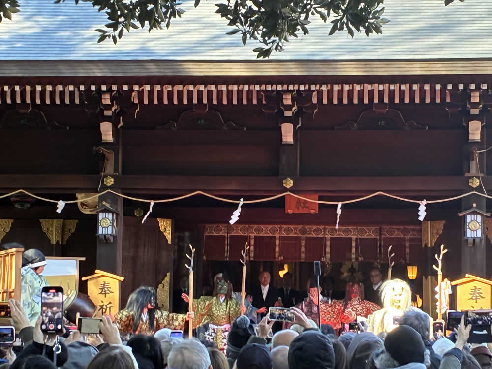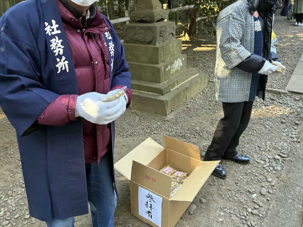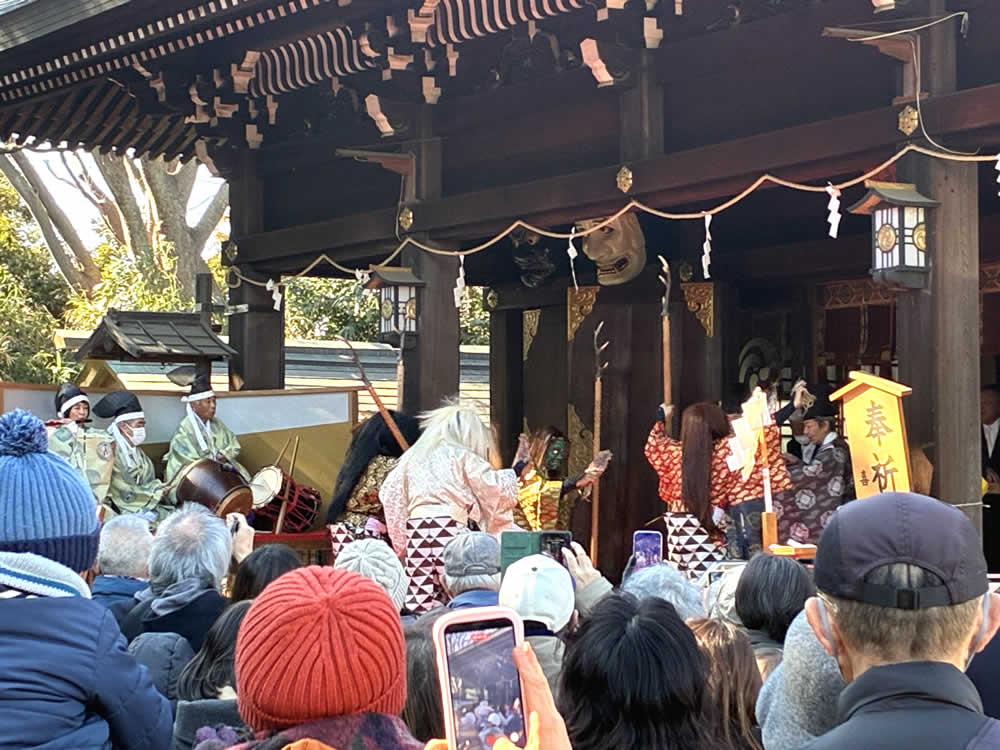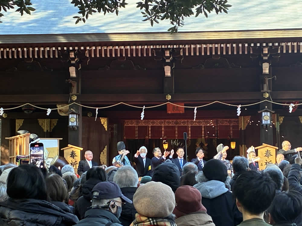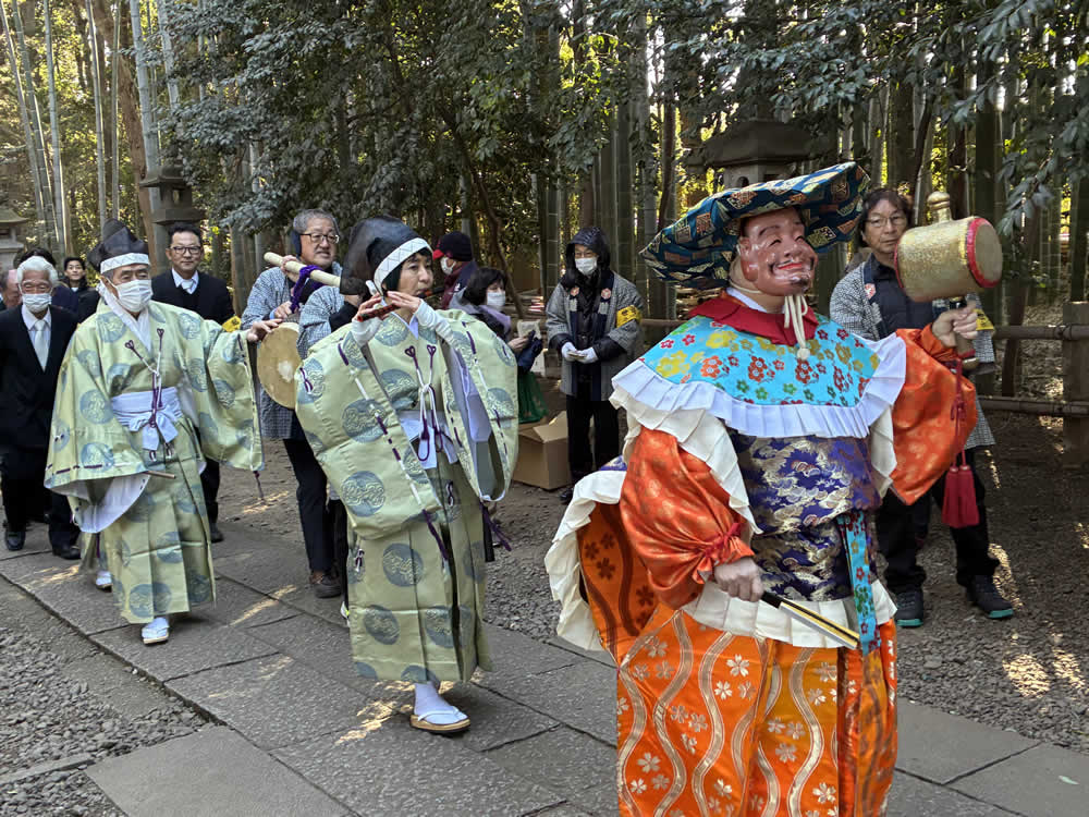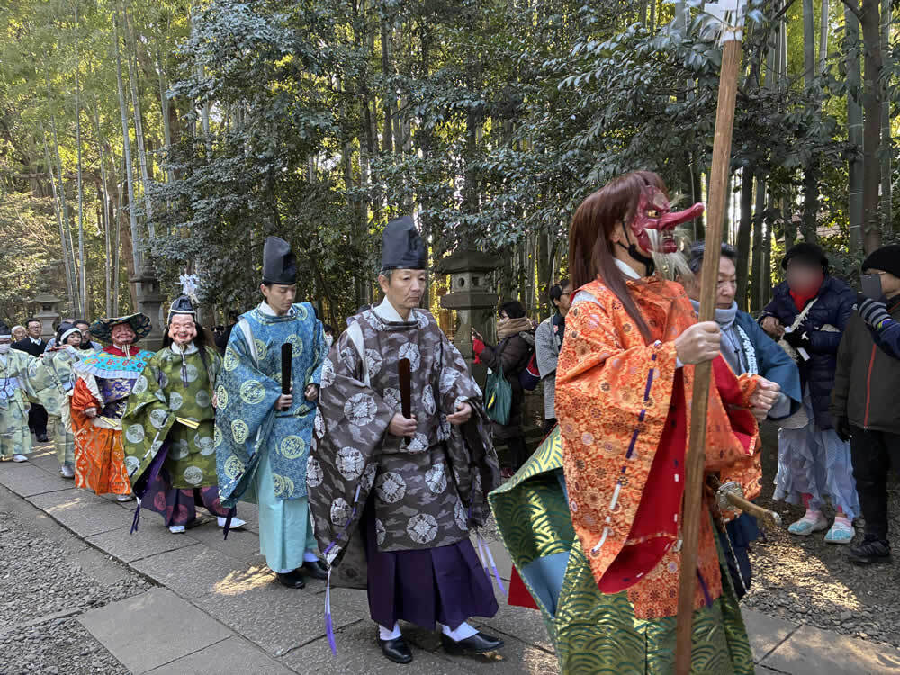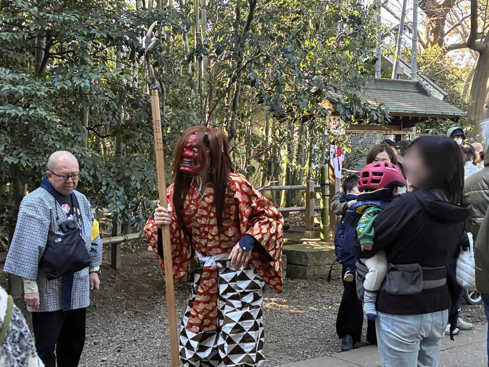 節分祭「鬼やらい」──鬼去りて、福来たる 2026.03.02オフィス 早咲きの梅がほころびはじめる頃、節分がやってきます。 今年は、喜多見の氷川神社で執り行われる節分祭「鬼やらい」に足を運びました。 世田谷区の無形民俗文化財にも指定されている貴重な神事です。 参道に並ぶのは、厄除けのお札入り福豆や御守り。 一陽来復を願う多くの人で、境内はすでに賑わいに包まれています。 参拝者一人ひとりに福豆が手渡され、大事そうに握りしめている人の姿も。 やがて鐘や太鼓の音が鳴ると、恵比寿様と大国様が姿を現します。 日常では近くで見ることのない福の神様。 近くをお通りになるだけで、福が舞い込んできそうなありがたさです。 澄んだ篠笛の音色とともに、行列はゆっくりと社殿へ。 祝詞奏上ののち、いよいよ来賓の方々の豆まきが始まりました。 太鼓が「ドン、ドン、ドン」と鳴り響くと、赤・青・黒・白の鬼がどこからともなく現れ、 境内からは「わぁ!」という声が上がります。 社殿に上がろうとする鬼と、それを拒む神官。 鬼と神官の掛け合いを行う儀式「鬼問答」が繰り広げられます。 「鬼は外!」 問答に敗れた鬼は、桃の弓、葦の矢、そしていり豆に追われ、山へ……。 ではなく、参道へ。 その後──。 「福は内!」の声が境内に響くと、福の神が神前へ。 恵比寿様が鯛を釣り上げ、大国様が小槌を振るう。 福を授ける舞が、静々と納められるとか。 その結末は、ぜひその目で。 Post Share Hatena Pocket RSS feedly オフィスまつり, 太鼓, 寺社